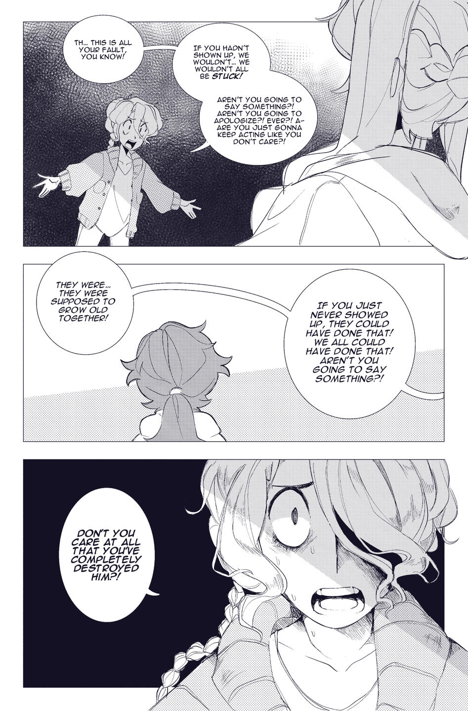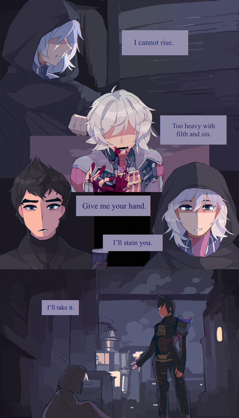 This page is for exhibiting my storytelling via comic pages. Some are related to personal projects, and some are fanart comics for video games and other media.This will include both fully rendered comic pages and short sketches. Approaching blood warning, as well as unnerving imagery.